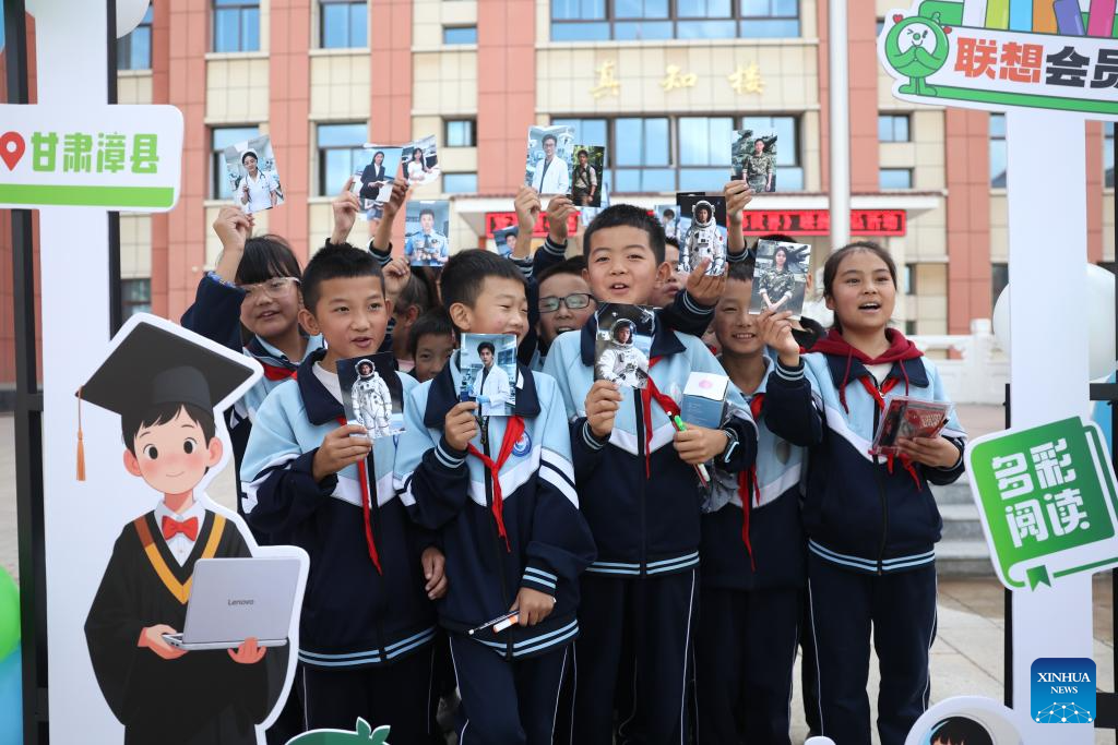 Children interact with a volunteer of China's multinational technology company Lenovo during an AI-themed lecture at Yanchuan school of Zhangxian County, Dingxi City of northwest China's Gansu Province, on Sept. 10, 2025. (Xinhua/Chen Bin)