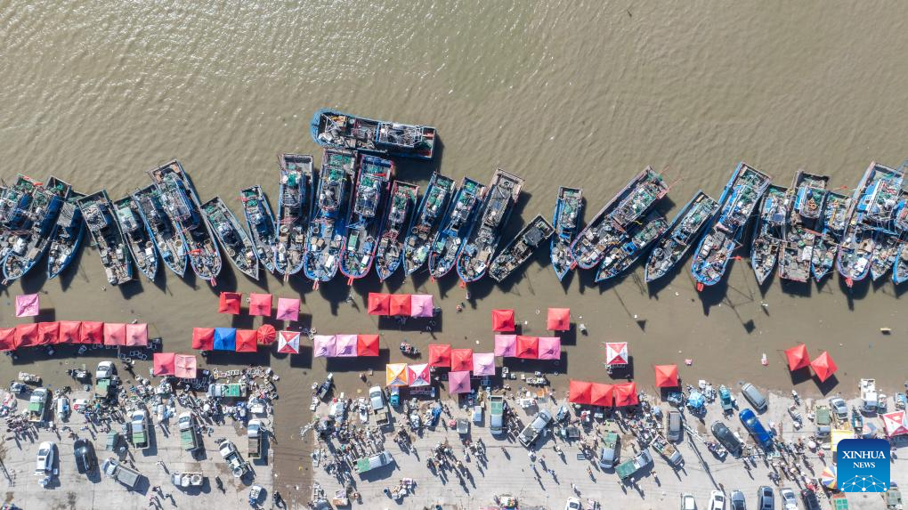 An aerial drone photo shows fishing boats at a port in Fengnan District of Tangshan, north China's Hebei Province, Sept. 8, 2025. (Photo by Li Xiuqing/Xinhua)