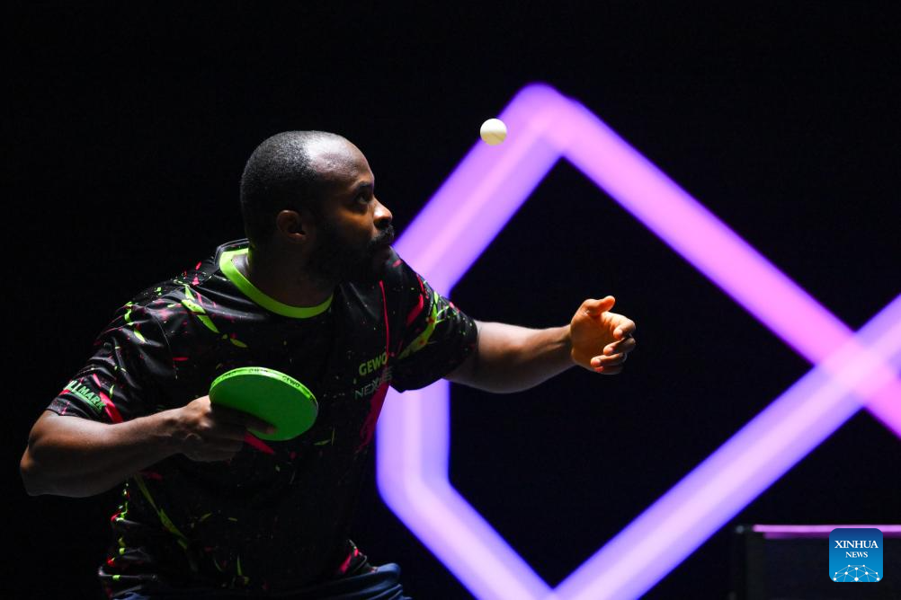 Quadri Aruna of Nigeria hits a return during the men's singles round of 16 match against Patrick Franziska of Germany at the 2025 World Table Tennis (WTT) Champions Macao in Macao, south China, Sept. 12, 2025. (Xinhua/Cheong Kam Ka)