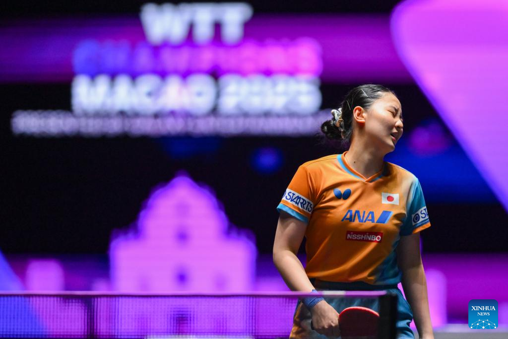Harimoto Miwa of Japan reacts during the women's singles round of 16 match against Odo Satsuki of Japan at the 2025 World Table Tennis (WTT) Champions Macao in Macao, south China, Sept. 12, 2025. (Xinhua/Cheong Kam Ka)