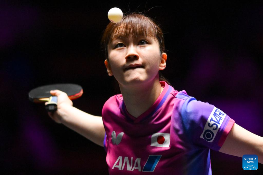 Harimoto Miwa of Japan hits a return during the women's singles round of 16 match against Odo Satsuki of Japan at the 2025 World Table Tennis (WTT) Champions Macao in Macao, south China, Sept. 12, 2025. (Xinhua/Cheong Kam Ka)