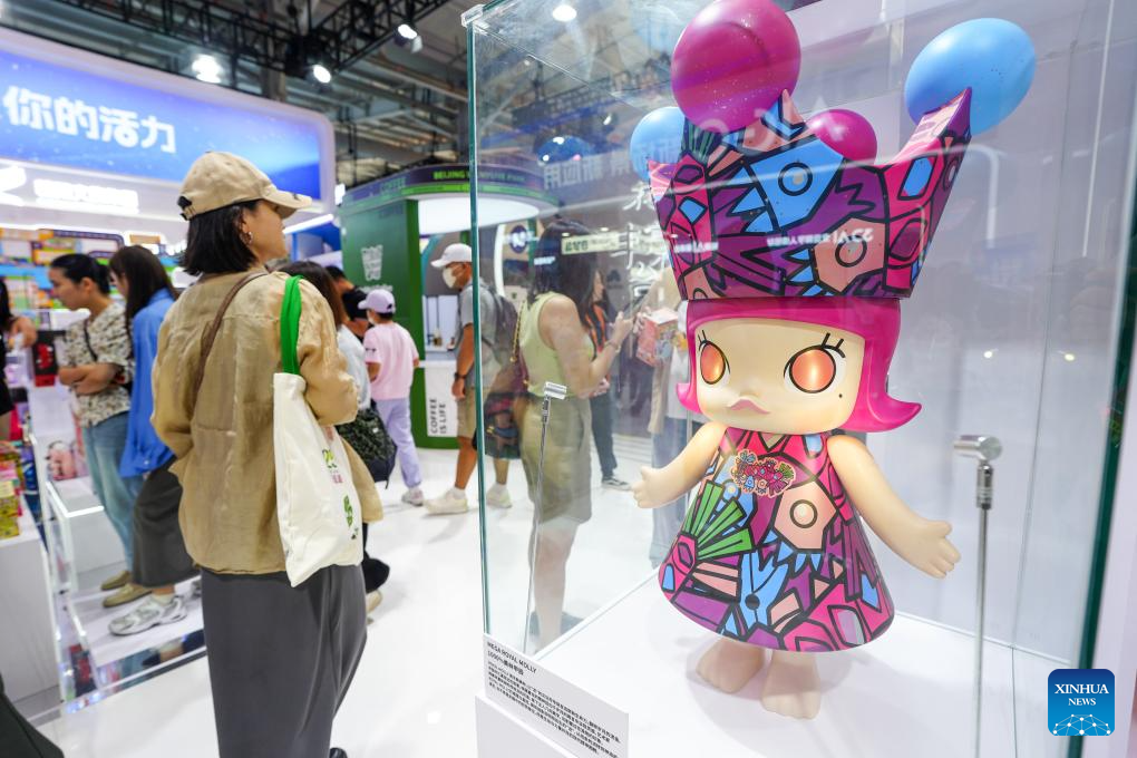 People view products of Pop Mart displayed at the 2025 China International Fair for Trade in Services (CIFTIS) in Beijing, capital of China, Sept. 12, 2025. The 2025 CIFTIS is held from Sept. 10 to 14 at the Shougang Park in Beijing. This year's fair features a wide range of cultural and creative products, which are highly popular among visitors. (Xinhua/Chen Yehua)