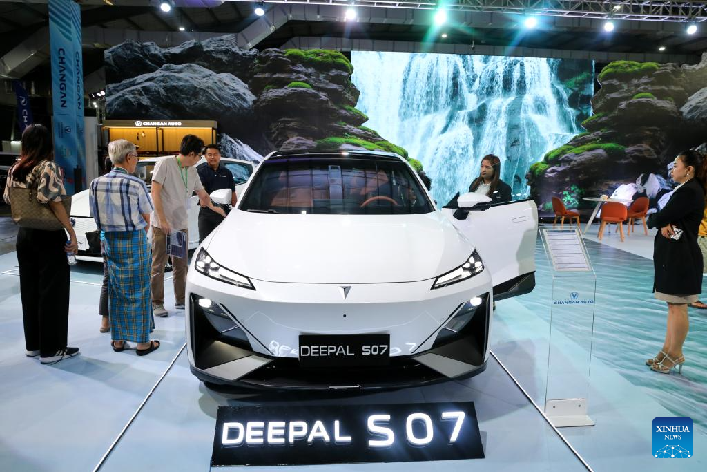 People visit the booth of BYD at the Myanmar Auto &Parts Expo 2025 in Yangon, Myanmar, Sept. 12, 2025. The expo kicked off here on Friday. (Xinhua/Myo Kyaw Soe)