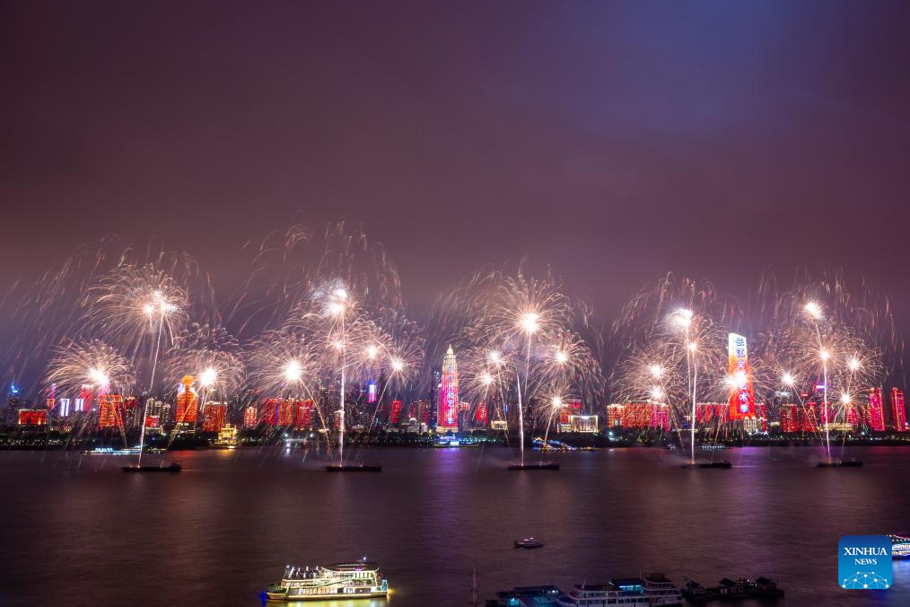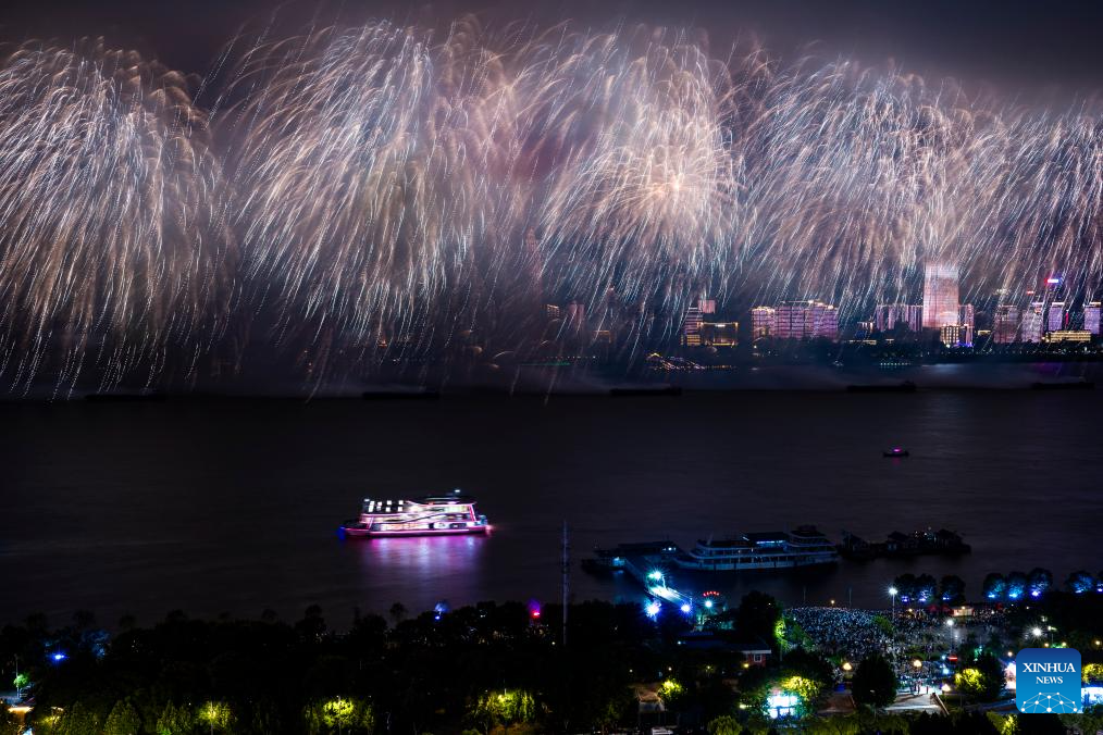 This photo taken on Sept. 12, 2025 shows fireworks during the opening ceremony of the 2025 Yangtze River cultural and arts season in Wuhan, central China's Hubei Province. The opening ceremony of the 2025 Yangtze River cultural and arts season was held in Wuhan on Friday. The event will run from Sept. 12 to Oct. 30, featuring a range of activities including art exhibitions, film week, and music week. (Xinhua/Wu Zhizun)