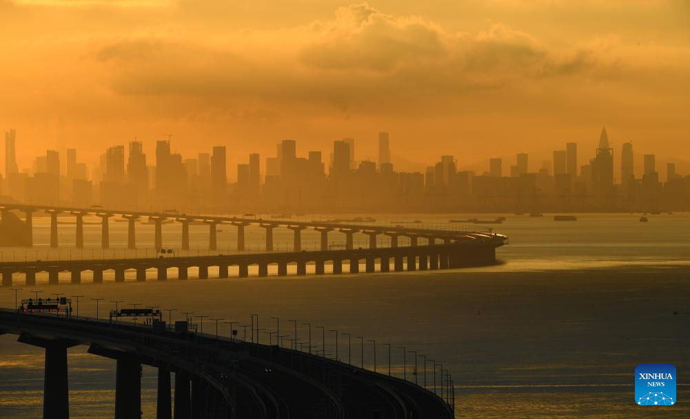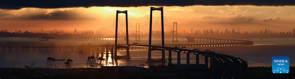 This stitched photo taken on Sept. 14, 2025 shows a section of the Shenzhen-Zhongshan link at sunrise in south China's Guangdong Province. (Xinhua/Deng Hua)
