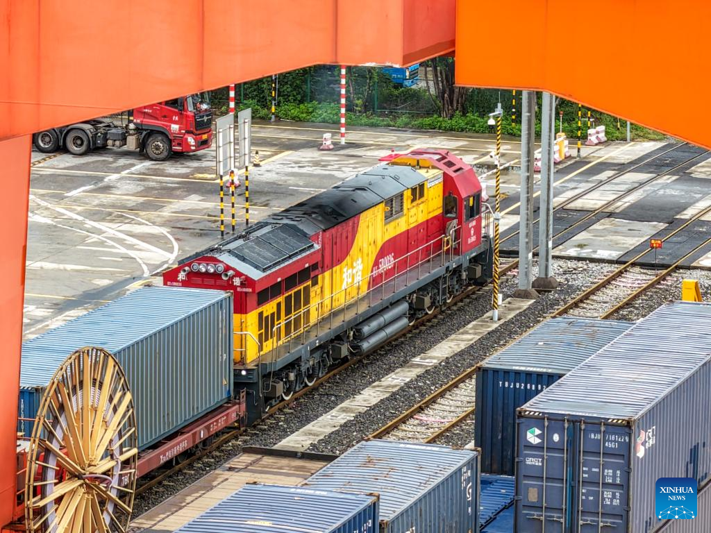 An aerial drone photo taken on Sept. 13, 2025 shows a freight train bound for Central Asia loaded with auto parts, laptops and other goods departing from Tuanjiecun Station in Chongqing, southwest China.