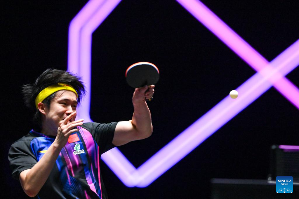 Wang Chuqin of China competes during the men's singles final match between Wang Chuqin of China and Hugo Calderano of Brazil at the 2025 World Table Tennis (WTT) Champions Macao in Macao, south China, Sept. 14, 2025. (Xinhua/Cheong Kam Ka)
