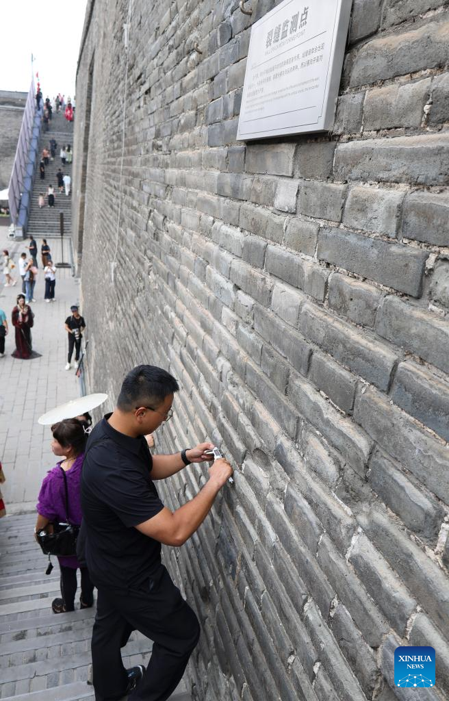 An inspector measures the length of a crack on the ancient city wall in Xi'an, northwest China's Shaanxi Province, Sept. 10, 2025. The 13.74-kilometer-long ancient city wall that surrounds Xi'an is one of the longest and best-preserved of its kind in China. A digital comprehensive management platform has been built for the wall since 2023, which integrates functions such as cultural relic protection, cultural tourism operation, emergency management, and flood-control command.