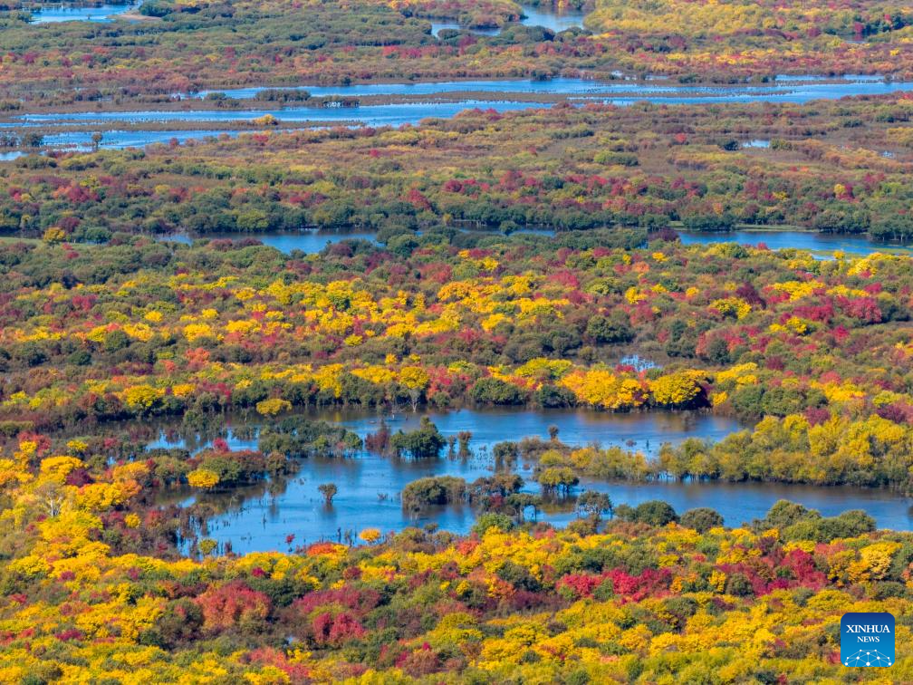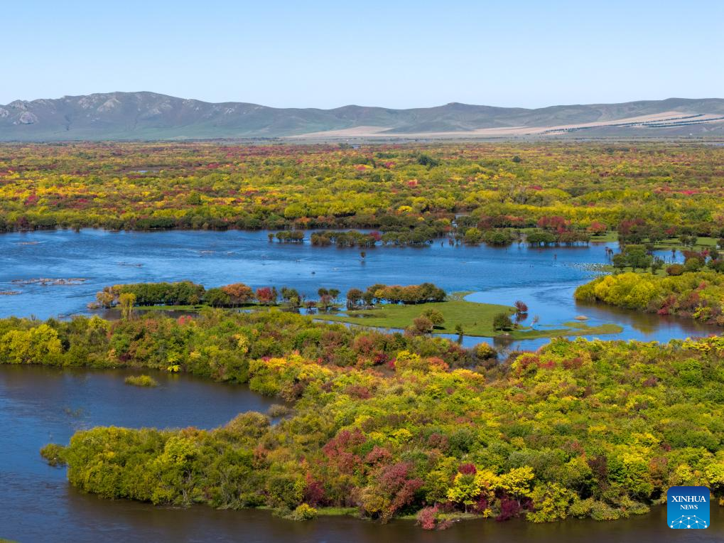 An aerial drone photo taken on Sept. 15, 2025 shows a view of the wetland around the Ergune River in Hulun Buir, north China's Inner Mongolia Autonomous Region. (Xinhua/Ma Jinrui)