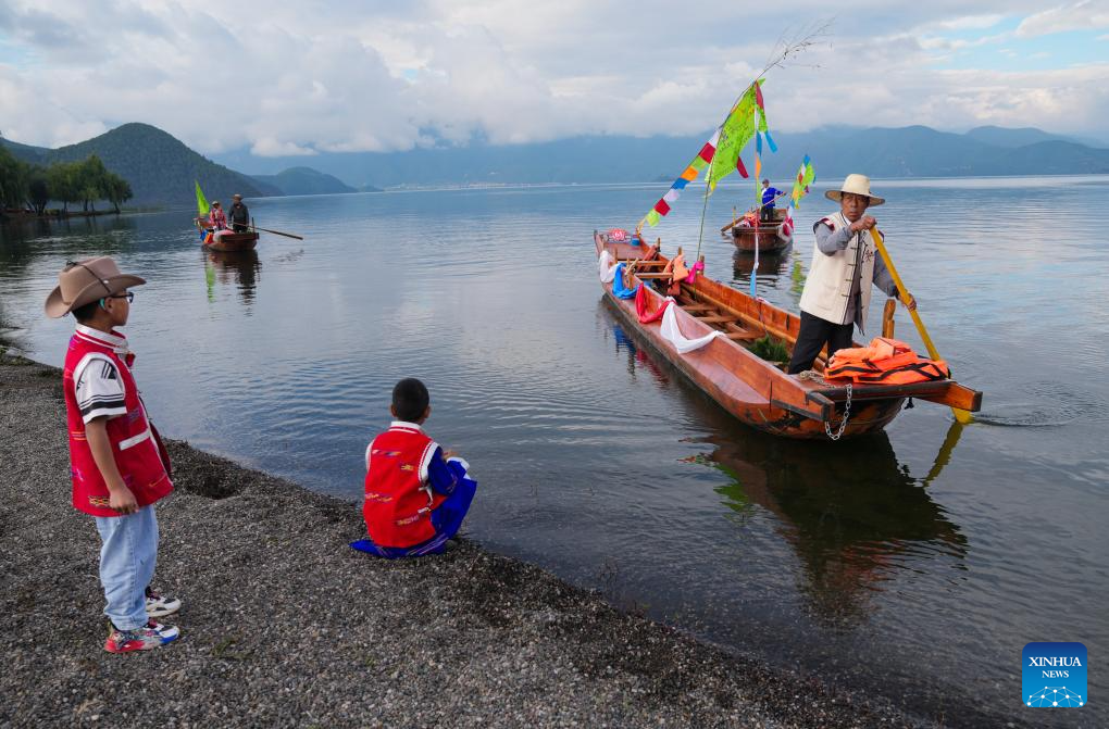 Local people dressed up prepare to circle the lake by boat in Yanyuan County of Liangshan Yi Autonomous Prefecture, southwest China's Sichuan Province, Sept. 16, 2025. The first mountain and lake circling festival of Lugu Lake kicked off at Liangshan Yi Autonomous Prefecture on Tuesday. Mountain and lake circling is an important folk custom of the Mosuo people living near Lugu Lake. Starting this year, Liangshan Prefecture has officially designated the 25th day of the seventh lunar month as the mountain and lake circling festival, making it a local statutory holiday. Residents of Yanyuan and Muli counties can enjoy a one-day exclusive holiday. (Xinhua/Jiang Hongjing)