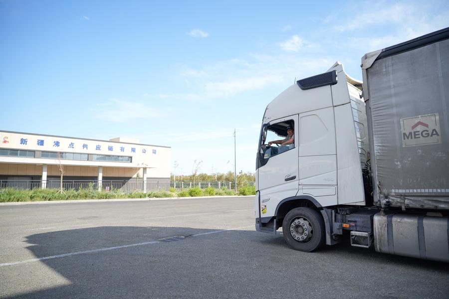 Sayat, a truck driver from Kazakhstan, waits to load goods at the Alashankou Cross-border E-commerce Industrial Park in northwest China's Xinjiang Uygur Autonomous Region, Sept. 11, 2025. (Xinhua/Zhang Haobo)