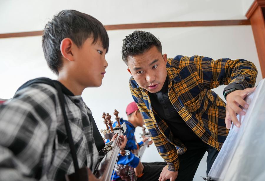 A teacher teaches students the playing skills of Zhanian, a traditional Tibetan stringed instrument, at a secondary vocational and technical school in Lhasa, southwest China's Xizang Autonomous Region, Sept. 9, 2025. (Xinhua/Zhang Xiaoyu)