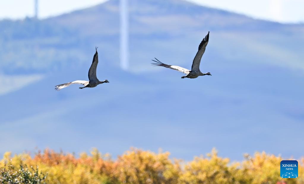 Grey cranes fly over the Ergune Wetland Nature Reserve in Hulun Buir, north China's Inner Mongolia Autonomous Region, Sept. 16, 2025. (Xinhua/Bei He)