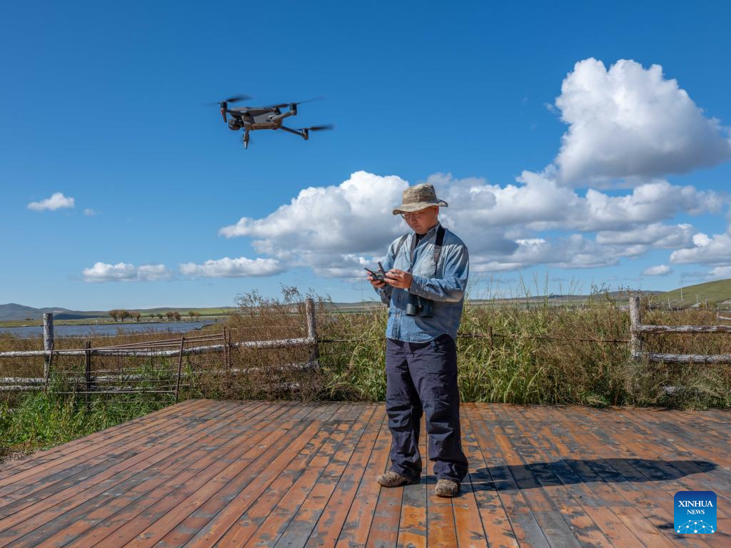 Bao Jincai operates a drone for daily patrol in the Ergune wetland in Hulun Buir, north China's Inner Mongolia Autonomous Region, Sept. 16, 2025. (Xinhua/Ma Jinrui)