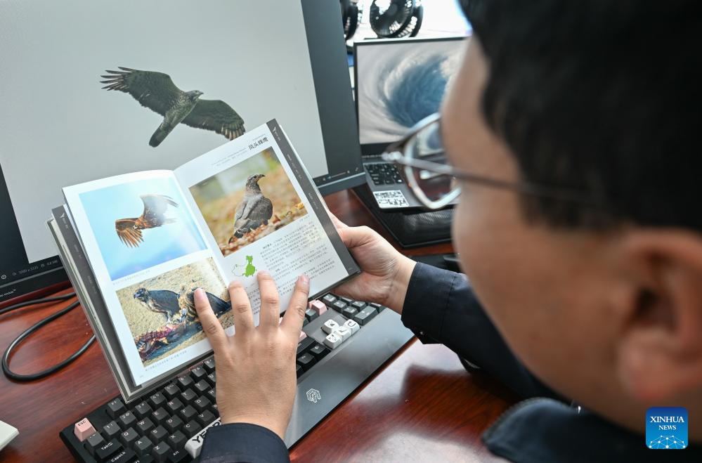 Bao Jincai identifies the oriental honey-buzzard from the photos he has taken at Ergune Wetland Nature Reserve Administration in Hulun Buir, north China's Inner Mongolia Autonomous Region, Sept. 16, 2025. (Xinhua/Bei He)