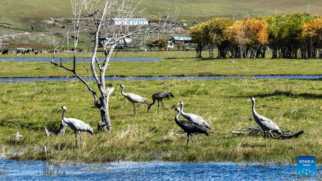 A drone photo taken on Sept. 16, 2025 shows grey cranes in the Ergune Wetland Nature Reserve in Hulun Buir, north China's Inner Mongolia Autonomous Region. (Xinhua/Ma Jinrui)
