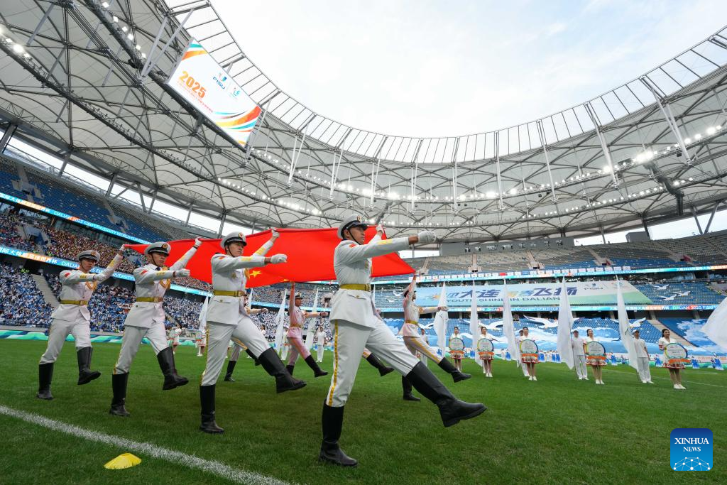 The Chinese national flag is carried during the opening ceremony of the 2025 FISU University World Cup Football held in Suoyuwan Stadium in Dalian, northeast China's Liaoning Province, Sept. 17, 2025. (Xinhua/Zheng Huansong)
