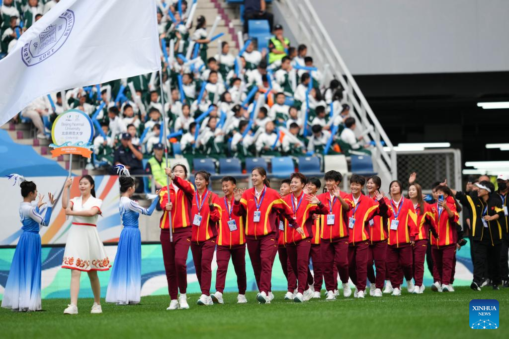 Delegation of Beijing Normal University from China parade during the opening ceremony of the 2025 FISU University World Cup Football held in Suoyuwan Stadium in Dalian, northeast China's Liaoning Province, Sept. 17, 2025. (Xinhua/Zheng Huansong)