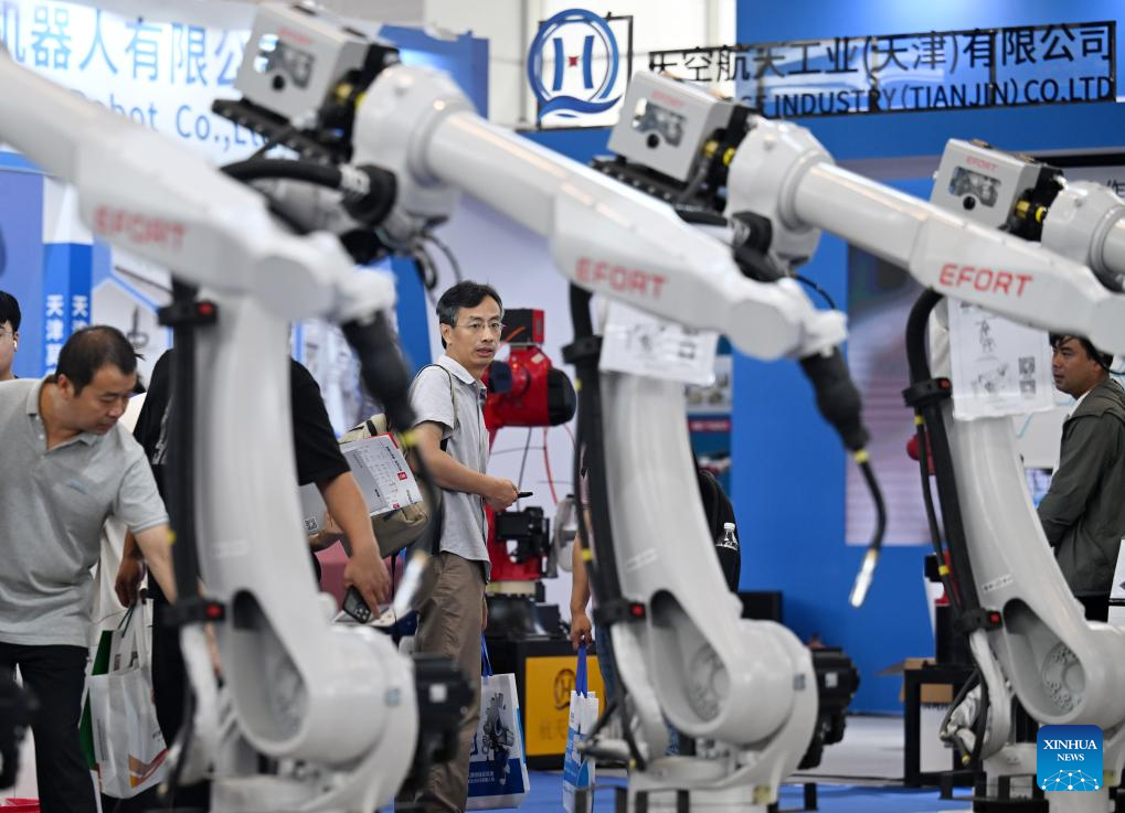 People learn about robotic arms at the National Convention and Exhibition Center (Tianjin) in north China's Tianjin Municipality, Sept. 17, 2025. The Tianjin International Machine Tool Exhibition kicked off at the National Convention and Exhibition Center (Tianjin) on Wednesday and will last till Sept. 20. An international exhibition on industrial automation and robotics is held here concurrently. (Xinhua/Zhao Zishuo)