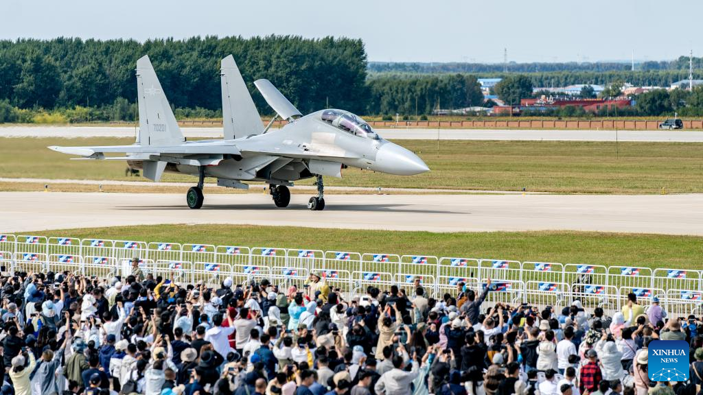 A J-16 fighter jet is pictured during the 2025 aviation open-day activities of the Chinese People's Liberation Army Air Force and Changchun Air Show in Changchun, northeast China's Jilin Province, Sept. 19, 2025. The events kicked off here on Friday. (Xinhua/Tang Chengzhuo)