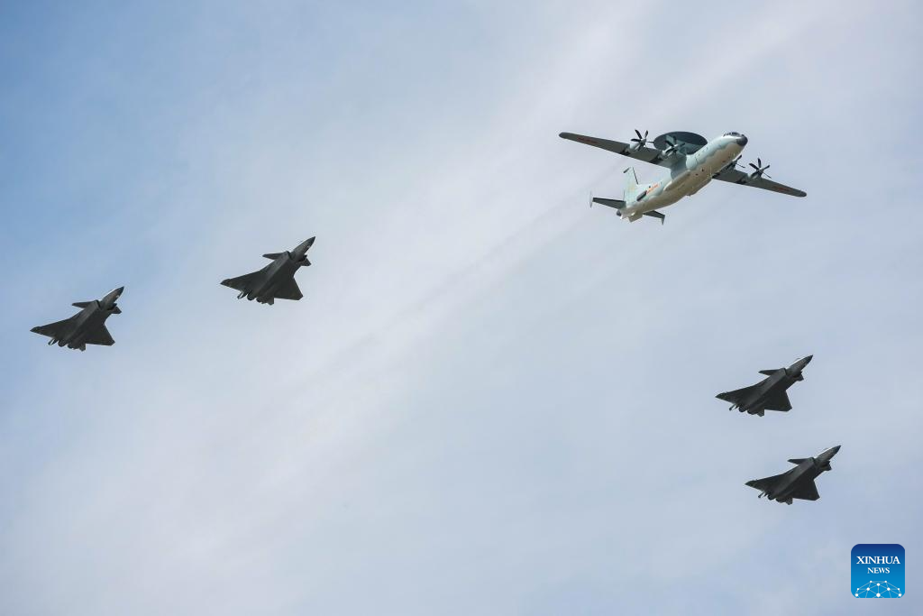 A KJ-500 early warning aircraft and four J-20 fighter jets are pictured during the 2025 aviation open-day activities of the Chinese People's Liberation Army Air Force and Changchun Air Show in Changchun, northeast China's Jilin Province, Sept. 19, 2025. The events kicked off here on Friday. (Xinhua/Zhang Nan)