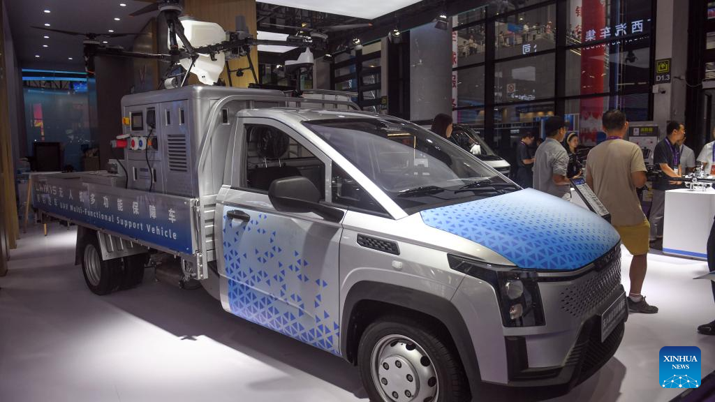 An unmanned aerial vehicle multi-functional support vehicle is seen at the Nanning International Convention and Exhibition Center in Nanning, capital of south China's Guangxi Zhuang Autonomous Region, Sept. 19, 2025. Products involving cutting-edge technologies such as artificial intelligence, low-altitude economy and humanoid robots are showcased during the ongoing 22nd China-ASEAN Expo.