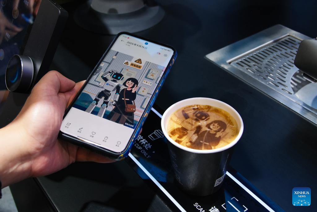 A visitor shows a coffee latte art made by a coffee robot at the Nanning International Convention and Exhibition Center in Nanning, capital of south China's Guangxi Zhuang Autonomous Region, Sept. 19, 2025. Products involving cutting-edge technologies such as artificial intelligence, low-altitude economy and humanoid robots are showcased during the ongoing 22nd China-ASEAN Expo.