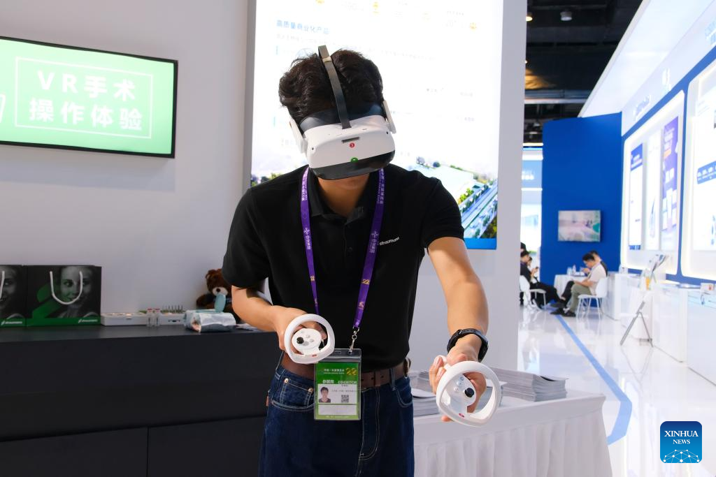 A staff member experiences the surgical operation process with a pair of VR glasses at the Nanning International Convention and Exhibition Center in Nanning, capital of south China's Guangxi Zhuang Autonomous Region, Sept. 19, 2025. Products involving cutting-edge technologies such as artificial intelligence, low-altitude economy and humanoid robots are showcased during the ongoing 22nd China-ASEAN Expo.