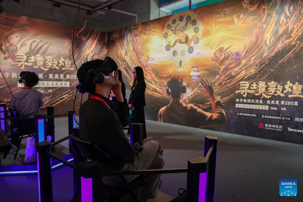A guest experiences VR devices to have an online tour of the Mogao Grottoes during the 8th Silk Road (Dunhuang) International Cultural Expo in Dunhuang, northwest China's Gansu Province, Sept. 21, 2025. More than 1,200 representatives from 97 countries and eight international organizations have gathered at the 8th Silk Road (Dunhuang) International Cultural Expo, which kicked off on Sunday in Dunhuang, a key hub on the ancient Silk Road in northwest China. (Xinhua/Lang Bingbing)