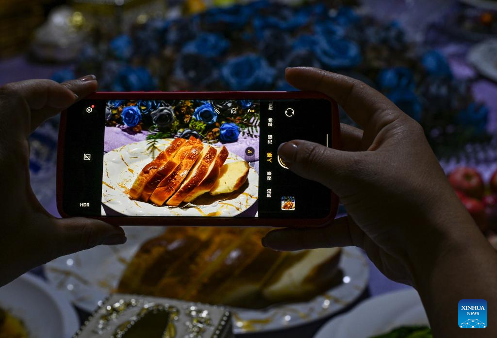 A guest takes photos of a loaf of Russian bread in Tacheng City, northwest China's Xinjiang Uygur Autonomous Region, Sept. 17, 2025.(Xinhua/Chen Shuo)