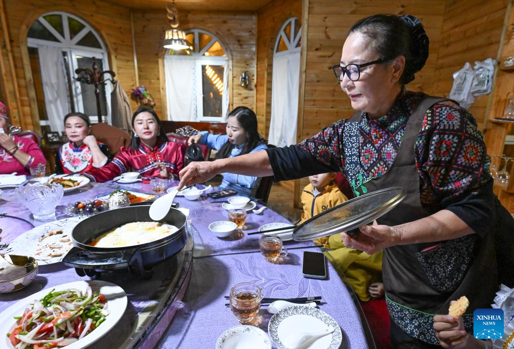 Ma Xiuhua serves dishes for her guests at her agritainment in Tacheng City, northwest China's Xinjiang Uygur Autonomous Region, Sept. 17, 2025.(Xinhua/Wang Fei)