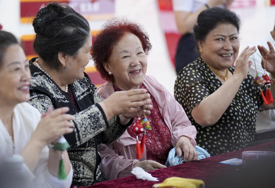 Residents make sachets during a celebration of the Dragon Boat Festival at Guyuanxiang Community in Urumqi, northwest China's Xinjiang Uygur Autonomous Region, June 6, 2024. (Xinhua/Wang Fei)