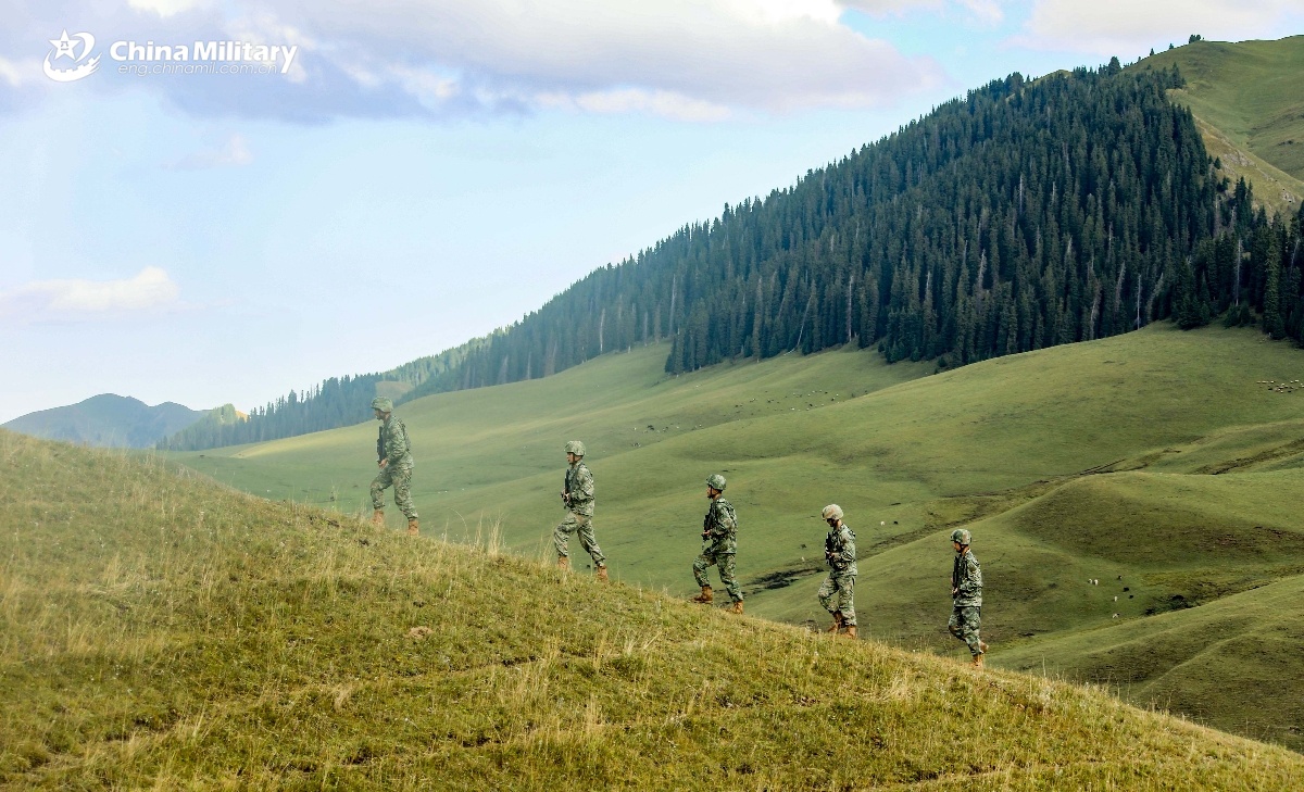 Soldiers assigned to a border defense company under the Chinese PLA Army walk along the mountain trail during a routine patrol mission in recent days. (eng.chinamil.com.cn/Photo by Zheng Yaqi)
