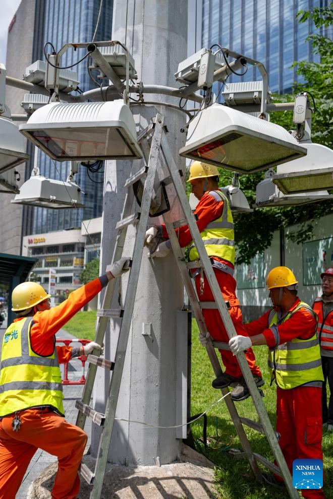 Staff members lower and reinforce the street lamps in Shenzhen, south China, Sept. 22, 2025. Shenzhen has activated emergency responses and taken various measures to battle Typhoon Ragasa. (Photo by Zhong Zijie/Xinhua)