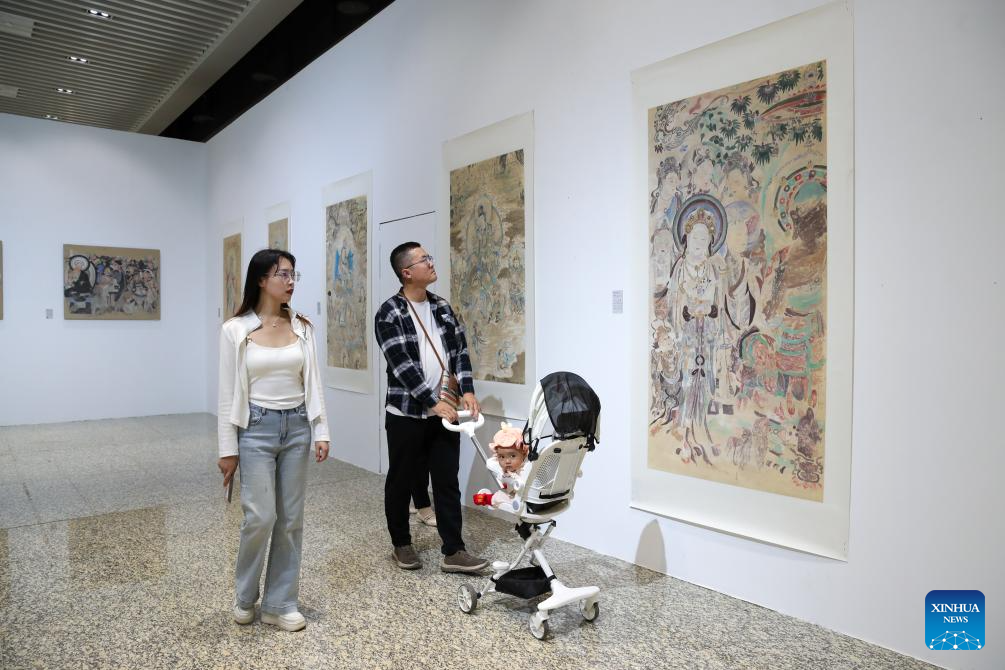 People visit an exhibition held by the Dunhuang Academy during the 8th Silk Road (Dunhuang) International Cultural Expo in Dunhuang, northwest China's Gansu Province, Sept. 22, 2025. More than 1,200 representatives from 97 countries and eight international organizations have gathered at the 8th Silk Road (Dunhuang) International Cultural Expo, which kicked off on Sunday in Dunhuang, a key hub on the ancient Silk Road in northwest China. (Xinhua/Lang Bingbing)