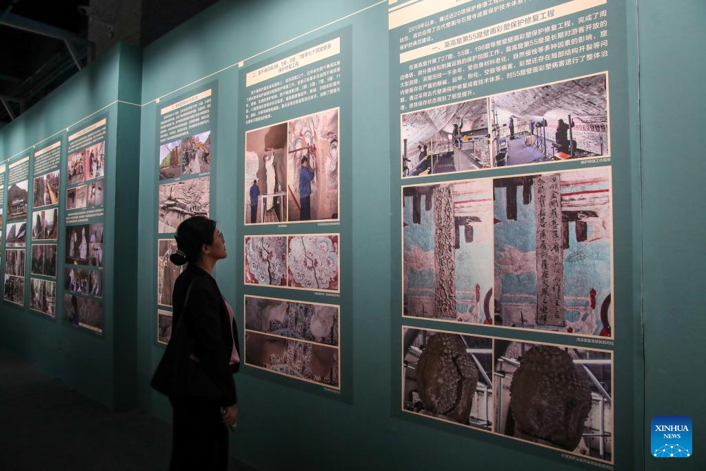 A visitor learns about the protection and restoration of the ancient murals of the Mogao Grottoes at an exhibition held by the Dunhuang Academy during the 8th Silk Road (Dunhuang) International Cultural Expo in Dunhuang, northwest China's Gansu Province, Sept. 22, 2025. More than 1,200 representatives from 97 countries and eight international organizations have gathered at the 8th Silk Road (Dunhuang) International Cultural Expo, which kicked off on Sunday in Dunhuang, a key hub on the ancient Silk Road in northwest China. (Xinhua/Lang Bingbing)