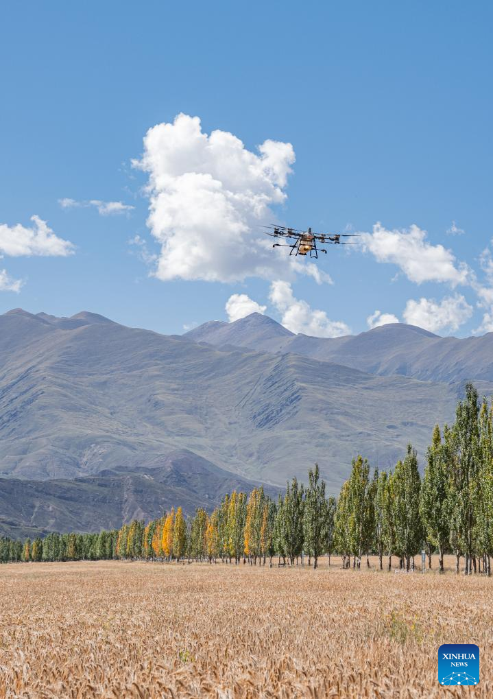An agricultural drone flies over a highland barley field in Lhunzhub County, in Lhasa, southwest China's Xizang Autonomous Region, Sept. 23, 2025. The Chinese farmers' harvest festival is the first national festival created specifically for the country's farmers. Starting in 2018, the festival coincides with the Autumnal Equinox each year, which is one of the 24 solar terms of the Chinese lunisolar calendar and usually falls between Sept. 22 and 24 during the country's agricultural harvest season. (Xinhua/Tenzin Nyida)