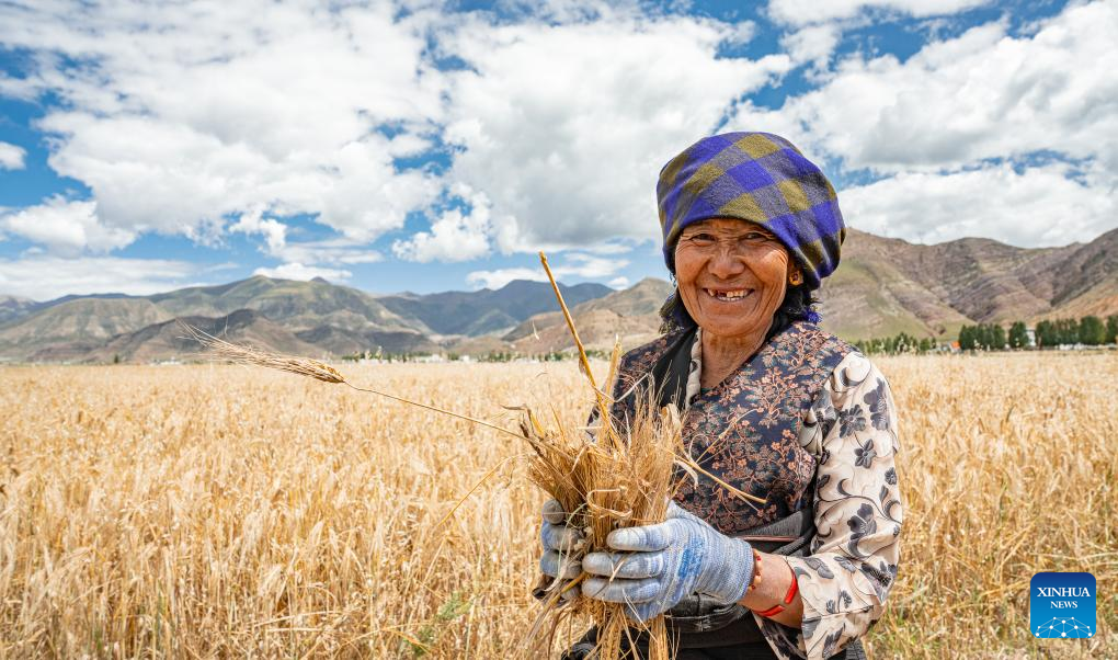 A farmer holds highland barley ears in Lhunzhub County, in Lhasa, southwest China's Xizang Autonomous Region, Sept. 23, 2025. The Chinese farmers' harvest festival is the first national festival created specifically for the country's farmers. Starting in 2018, the festival coincides with the Autumnal Equinox each year, which is one of the 24 solar terms of the Chinese lunisolar calendar and usually falls between Sept. 22 and 24 during the country's agricultural harvest season. (Xinhua/Tenzin Nyida)