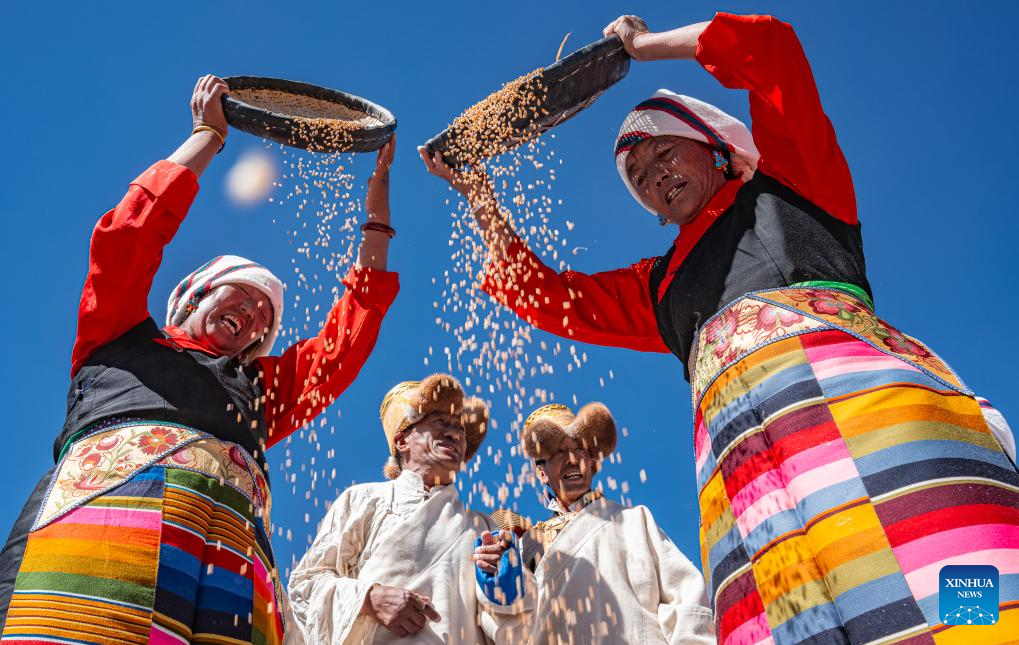 Farmers thresh crops in a traditional way in Lhunzhub County, in Lhasa, southwest China's Xizang Autonomous Region, Sept. 23, 2025. The Chinese farmers' harvest festival is the first national festival created specifically for the country's farmers. Starting in 2018, the festival coincides with the Autumnal Equinox each year, which is one of the 24 solar terms of the Chinese lunisolar calendar and usually falls between Sept. 22 and 24 during the country's agricultural harvest season. (Xinhua/Tenzin Nyida)