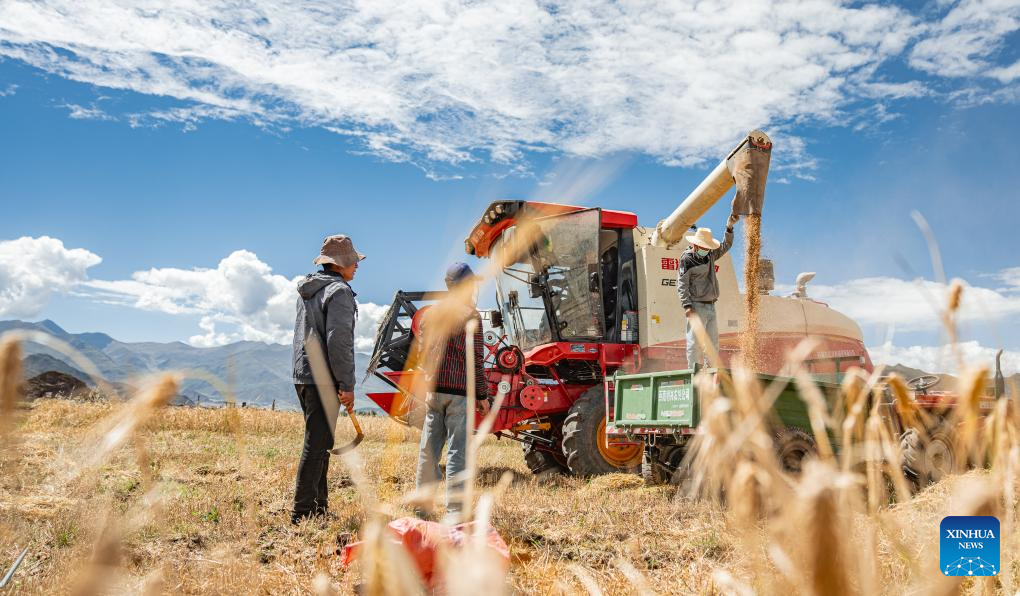 Farmers harvest highland barley with a harvester in Lhunzhub County, in Lhasa, southwest China's Xizang Autonomous Region, Sept. 23, 2025. The Chinese farmers' harvest festival is the first national festival created specifically for the country's farmers. Starting in 2018, the festival coincides with the Autumnal Equinox each year, which is one of the 24 solar terms of the Chinese lunisolar calendar and usually falls between Sept. 22 and 24 during the country's agricultural harvest season. (Xinhua/Tenzin Nyida)