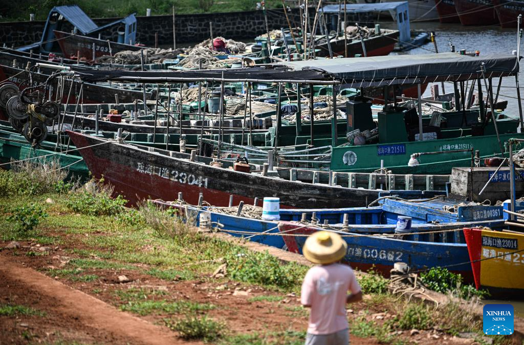 Fishing boats are docked to shelter from the wind in Haikou, south China's Hainan Province, Sept. 23, 2025. Typhoon Ragasa is expected to impact the island province of Hainan, with the provincial capital Haikou to suspend classes, ferry services, park operations, work and business activities starting later on Tuesday or Wednesday. All train services to and from the island will be canceled on Wednesday. (Xinhua/Pu Xiaoxu)