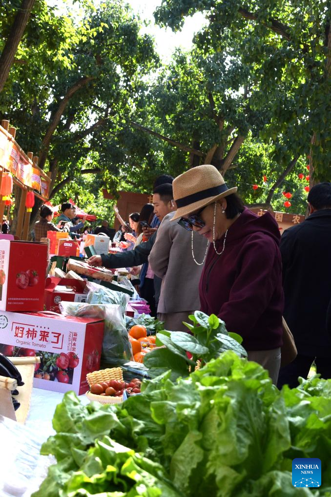 People select local specialty agricultural products at the Chinese farmers' harvest festival celebrations in Gaolan County, Lanzhou, northwest China's Gansu Province, Sept. 23, 2025. The Chinese farmers' harvest festival is the first national festival created specifically for the country's farmers. Starting in 2018, the festival coincides with the Autumnal Equinox each year, which is one of the 24 solar terms of the Chinese lunisolar calendar and usually falls between Sept. 22 and 24 during the country's agricultural harvest season. (Xinhua/Wang Peng)