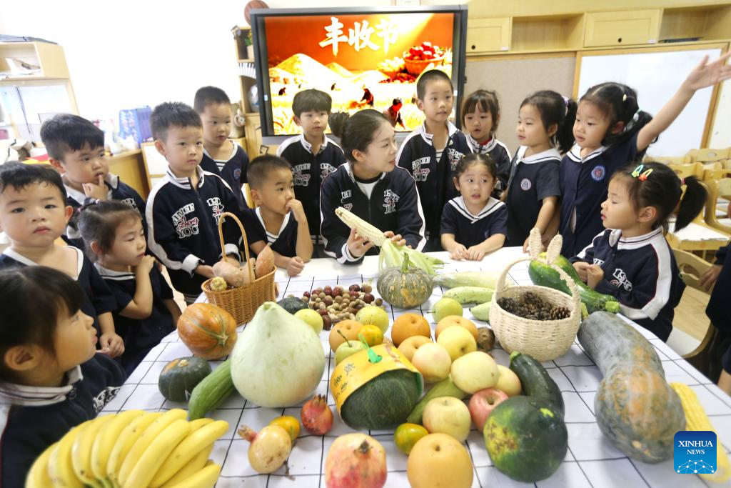A teacher explains knowledge about agricultural products to children during an activity at a kindergarten on the occasion of Chinese farmers' harvest festival celebrations in Lianyungang City, east China's Jiangsu Province, Sept. 23, 2025. The Chinese farmers' harvest festival is the first national festival created specifically for the country's farmers. Starting in 2018, the festival coincides with the Autumnal Equinox each year, which is one of the 24 solar terms of the Chinese lunisolar calendar and usually falls between Sept. 22 and 24 during the country's agricultural harvest season. (Photo by Wang Chun/Xinhua)