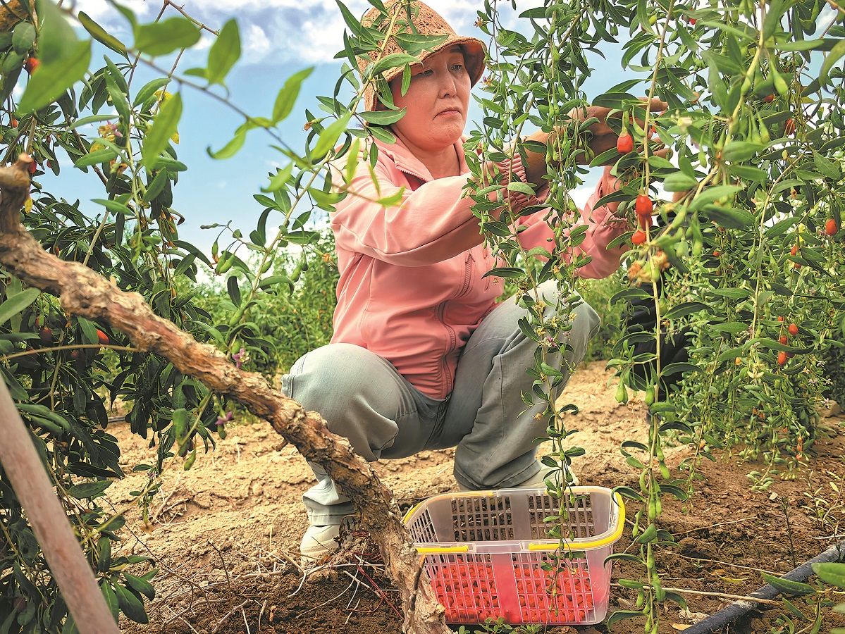 A villager picks goji berries in Jinghe county on Sept 11. ZHAO YIMENG/CHINA DAILY