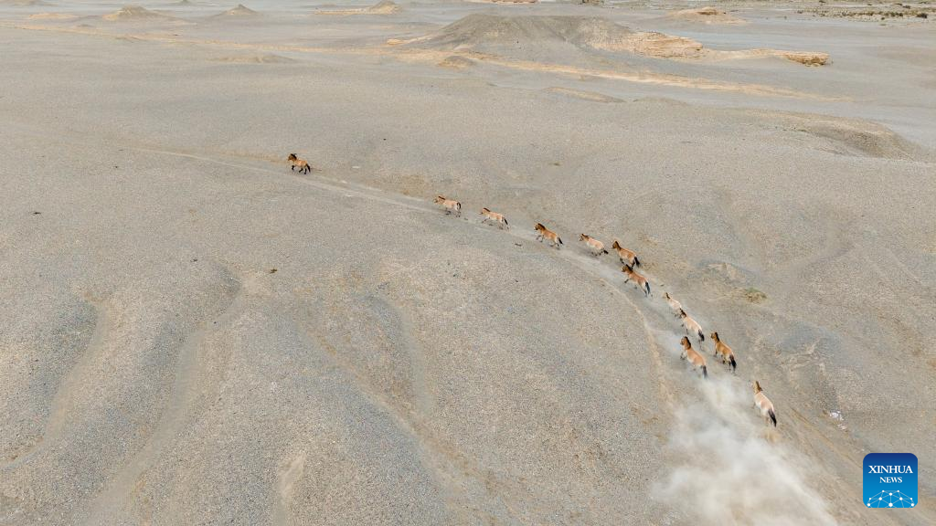 An aerial drone photo taken on Sept. 24, 2025 shows the Przewalski's horses in the Dunhuang West Lake National Nature Reserve, in Dunhuang, northwest China's Gansu Province. The Dunhuang West Lake National Nature Reserve in Gansu Province covers an area of approximately 660,000 hectares, featuring a diverse ecosystem including wetlands, grasslands, forests and Gobi deserts, which makes it an experimental zone for the wild release of the Przewalski's horses. (Xinhua/Lang Bingbing)