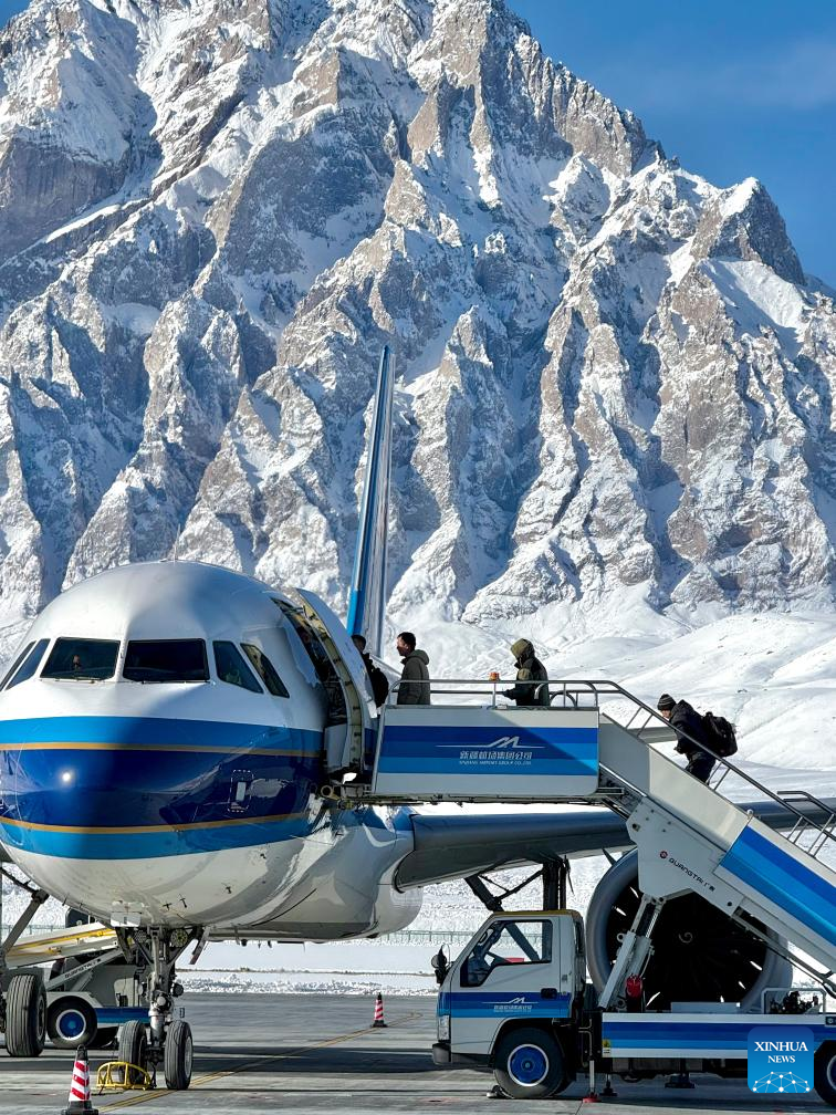 Passengers board an airplane at the Taxkorgan Khunjerab airport in Taxkorgan Tajik Autonomous County, northwest China's Xinjiang Uygur Autonomous Region, Jan. 13, 2025. Xinjiang is seeing increased vitality across the board as the region accelerates its efforts to the construction of the New International Land-Sea Trade Corridor, a key logistics network connecting China's western regions to global markets. (Xinhua/Chen Shuo)