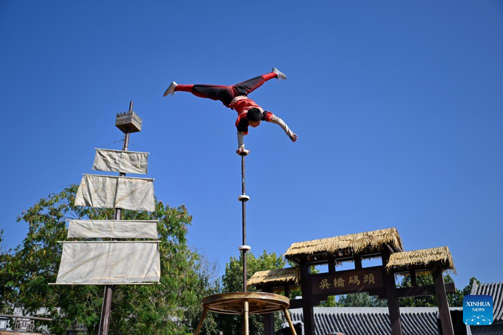 An acrobat performs at Wuqiao Acrobatics World in Wuqiao County of Cangzhou, north China's Hebei Province, Sept. 25, 2025. Wuqiao Acrobatics World, an acrobatics themed park, is a bustling folklore attraction and multi-functional complex combining services including entertainment, cultural experiences, exhibitions, training, competitions and cultural exchanges. (Xinhua/Mu Yu)