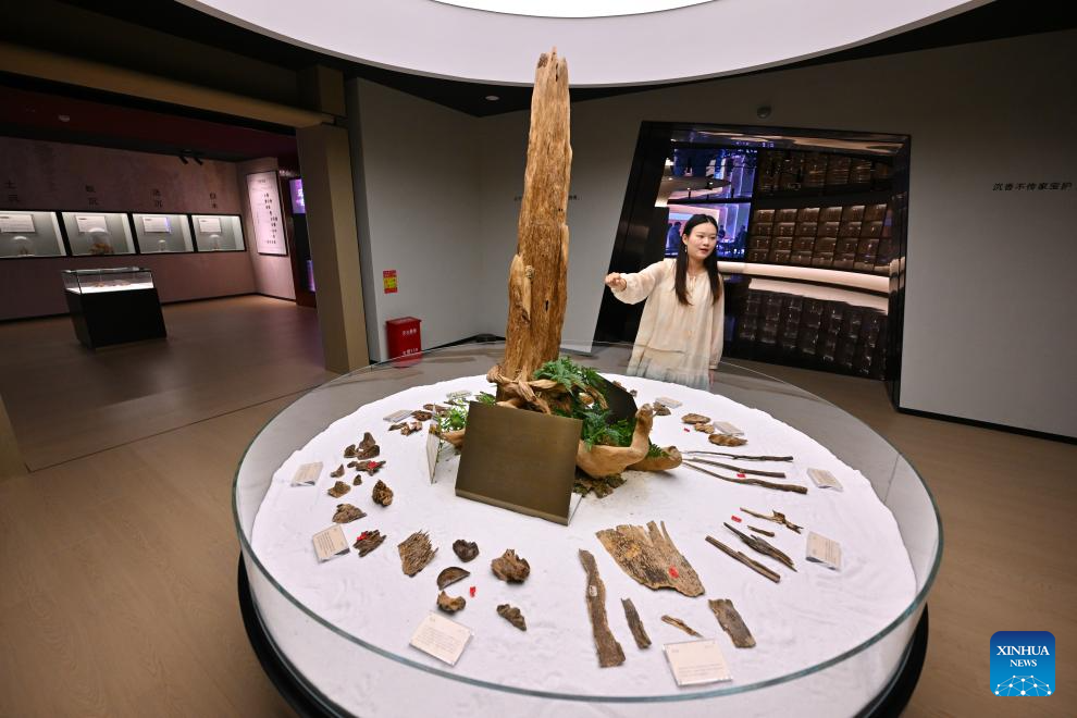 A staff member introduces the agarwood raw materials for making natural incense at an agarwood museum in Xianyou County, southeast China's Fujian Province, on Sept. 24, 2025. Xianyou County is a significant trading and distribution center for agarwood and sandalwood in China. In recent years, the county has been working on the development of its incense-related business by leveraging the abundance in raw materials, a mature incense-making industrial chain, and online and offline sales networks there. (Xinhua/Jiang Kehong)