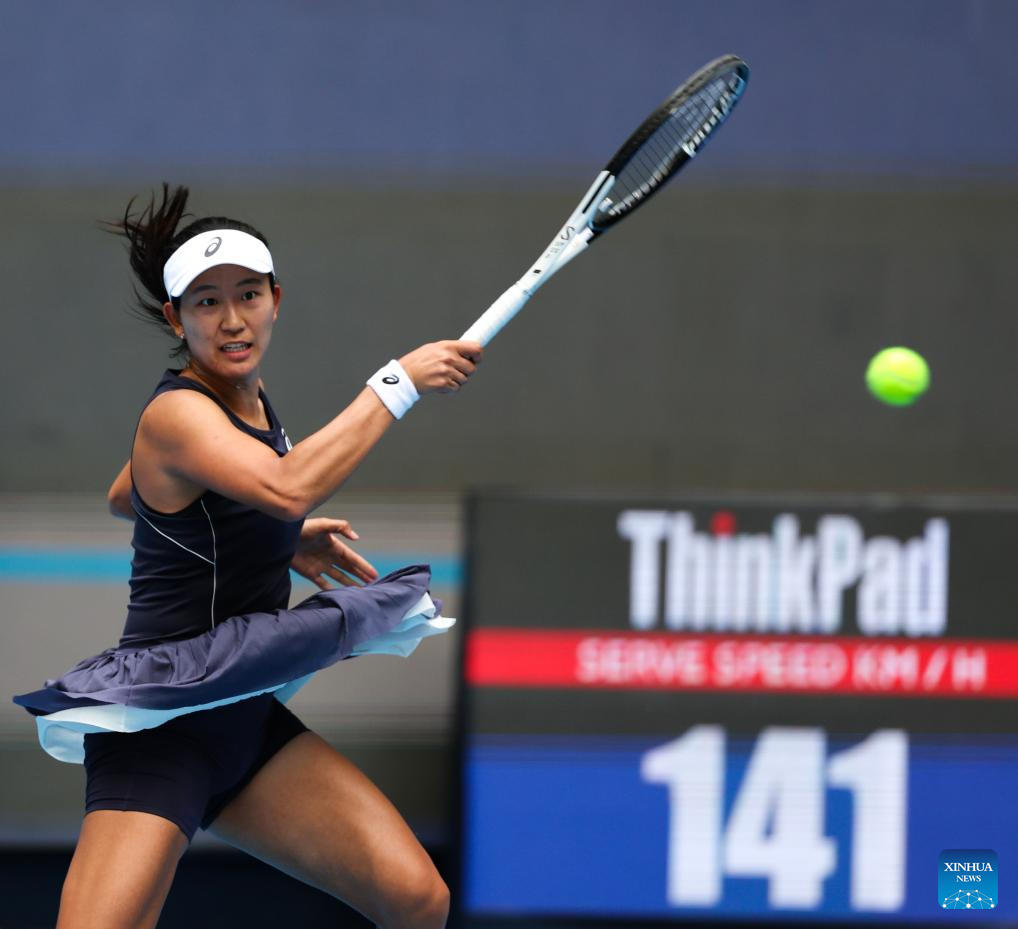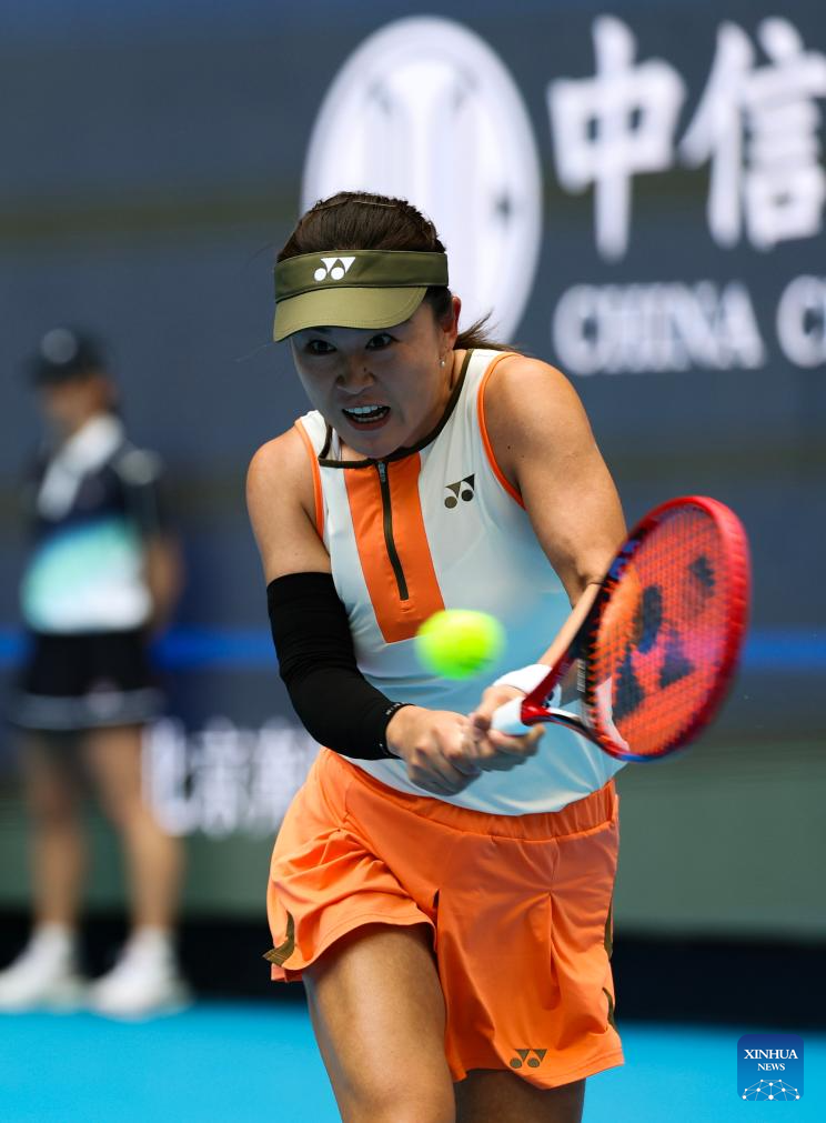Zhu Lin hits a return during the women's singles first round match between Zhu Lin of China and Uchijima Moyuka of Japan at 2025 China Open tennis tournament in Beijing, China, Sept. 25, 2025. (Xinhua/Du Xinyi)