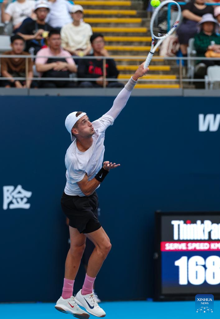Terence Atmane serves during the men's singles first round match between Zhang Zhizhen of China and Terence Atmane of France at 2025 China Open tennis tournament in Beijing, China, Sept. 25, 2025. (Photo by Ma Zihan/Xinhua)